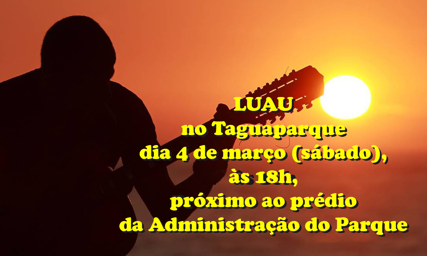 Amigos o horário mudou, vamos nos encontrar às 19h30 e ás 20h começamos. O ponto de encontro é ao lado da Administração do Parque, mas se por lá não estiver legal vamos em direção a Fonte. Aos que forem sugiro levar um banquinho, vamos nos sentar na grama. Se chover vamos tocar em baixo da marquise da Administração, qualquer dúvida me enviem um zap. “Corrigindo – sábado 05/03. Ulisses